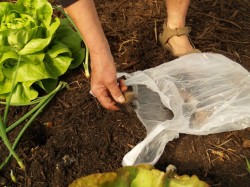 Vorig jaar kregen we als tip het gebruik van mensenhaar, en dat hebben we nu voor het eerst in de plastic tunnels geprobeerd. Ik heb mijn mannen hun haar laten knippen door mijn vrouw en hun haar laten bijhouden. Dat hebben we gisteren in de gangen rond de ajuintjes gestoken, in de hoop dat dit inderdaad effectief gaat zijn.