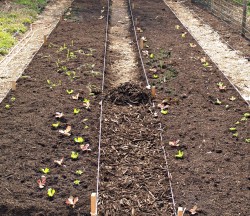 Wanneer wij onze bedden aanleggen beginnen we met een leeg stuk grond. De mulchlaag wordt er afgehaald, het stuk grond ligt mooi effen. Dan spannen we met koorden en paaltjes de bedden af die worden opgevuld met een dikke laag compost, zo’n 10 – 15 cm dik.