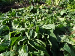 Met een dikke laag bedoel ik toch een laag van ongeveer 10 – 15 cm vers gewas. Dit zorgt ervoor dat u een grote hoeveelheid smeerwortel nodig heeft, en dus ook veel planten moet hebben staan. Wij planten elk jaar op verschillende plaatsen bij, maar hebben momenteel nog bijlange niet genoeg om alles te kunnen mulchen met smeerwortel.