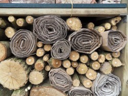 Het wordt opgevuld met allerhande materialen zodat het meer is dan een bijenhotel. Zaken zoals stro, leem, houtblokken, bladeren, opgerold karton en bakstenen gaan erin. De voet wordt bedekt met (grote) stenen en zand om andere soorten wilde bijen aan te trekken.