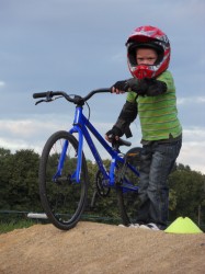 Hij rijdt nog maar sinds vorig najaar en zit samen met 11 anderen in de beginnersgroep. Waar ze zich hele trainingen mee bezig houden is de start.