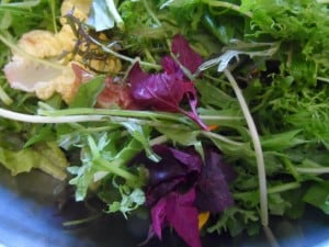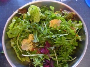 We hebben rekening gehouden met de verschillende kleuren en structuren van de sla, voor de kruiden hebben we tot nu toe vooral de courante soorten gebruikt. Sommige hebben we niet moeten zaaien maar groeien al jaren in onze tuin: koriander, venkel, goudsbloem, viooltjes, Hemerocallis, … Ook deze bieden allemaal een mooie extra touch aan de mengeling.